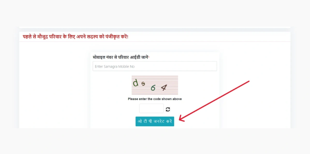 - इसके बाद परिवार आईडी प्राप्त करने के लिए वही मोबाइल नंबर दर्ज करें, जिसका उपयोग आपने परिवार पंजीकरण के समय किया था।
