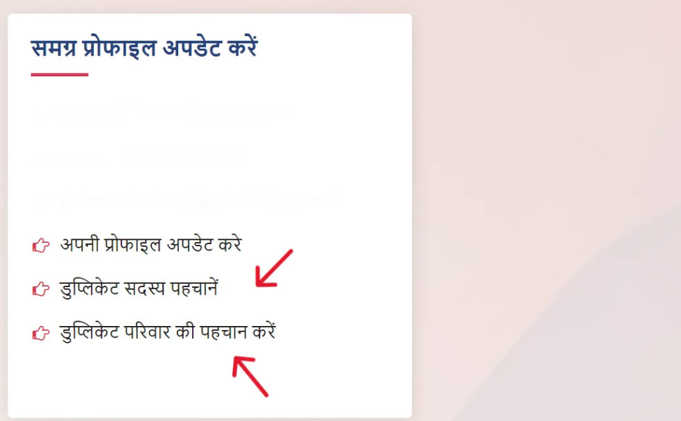 यदि आप समग्र पोर्टल (samagra portal) पर डुप्लीकेट समग्र परिवार या सदस्य की पहचान करना चाहते हैं, तो नीचे दिए गए चरणों का पालन करें-